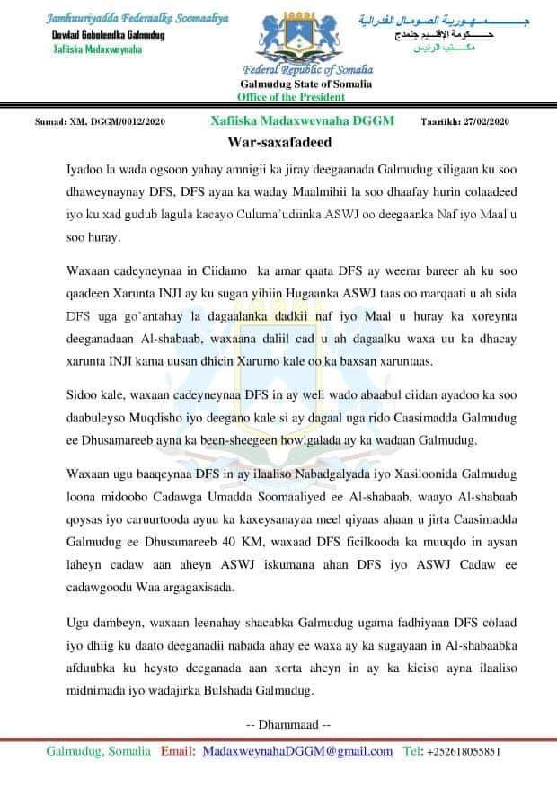 Ahlusunna ayaa Warsaxafadood ay dhankooda soo saareen waxa ay ku eedeysay Dowladda Somaliya in ciidamadooda ay soo warareen Xarunta Inji oo ay daganyihiin Masuuliyiinta Ahlusunna.