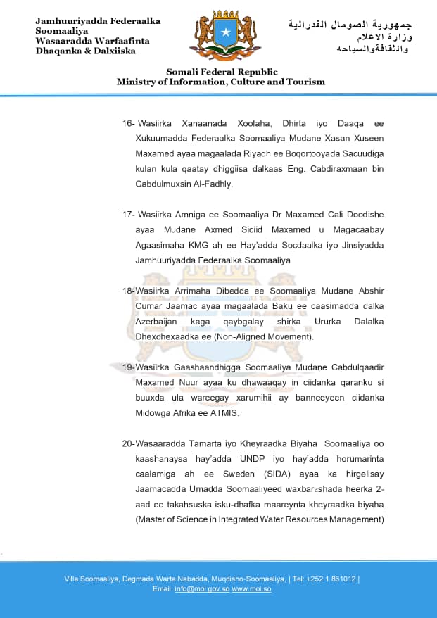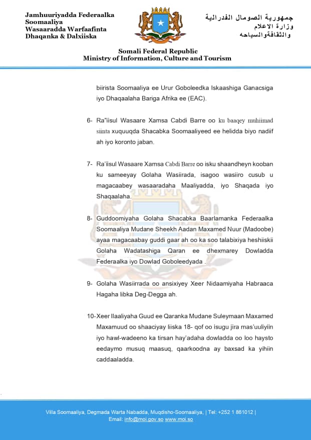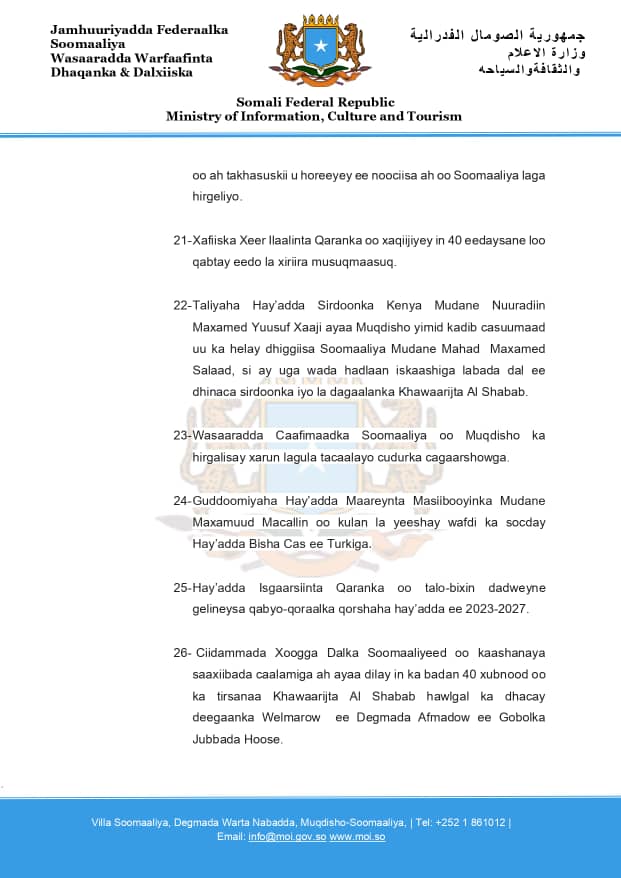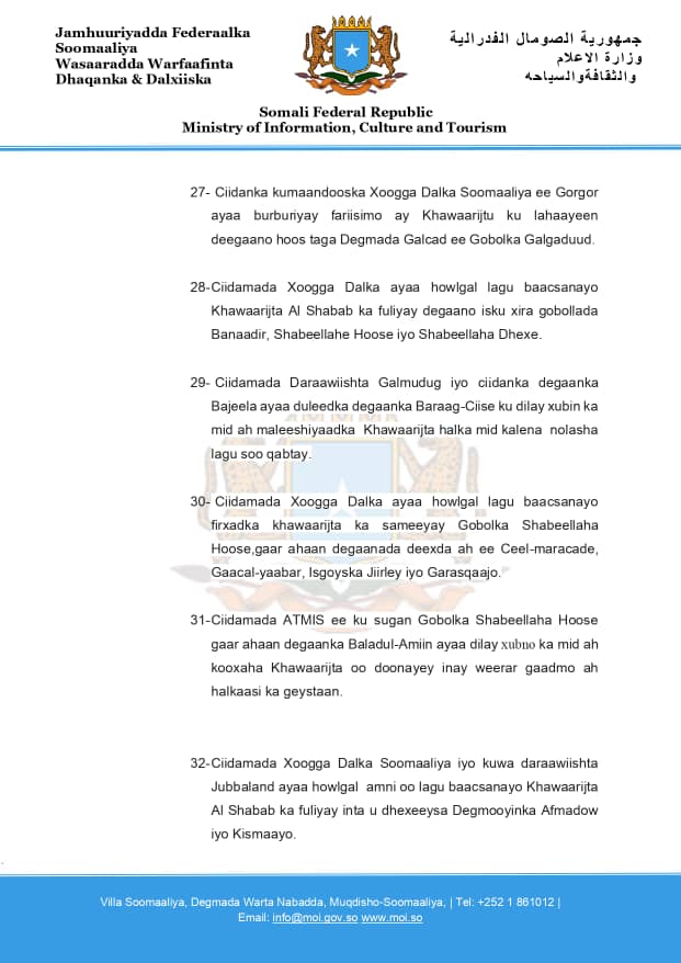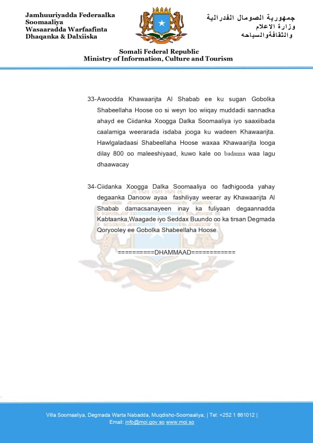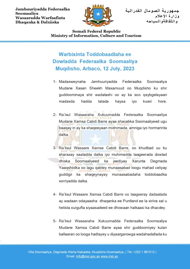 Aqriso:Warbixinta Todobaadlaha ee Waxqabadka Dowlada Federal Soomaaliya 12/07/2023 FacebookTwitterLinkedinEmailPrint Warbixinta Toddobaadlaha ee waxqabadka Dowladda Federaalka Soomaaliya . Hoose ka Aqriso:-