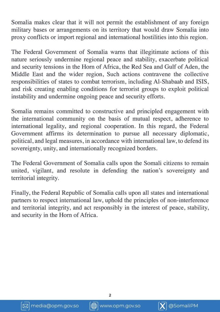 Dowladdu waxay ugu baaqday beesha caalamka inay ixtiraamto madax-bannaanida iyo midnimada dhuleed ee Soomaaliya, iyadoo mar kale muujisay taageeradeeda xuquuqda shacabka Falastiin iyo ka shaqeynta nabadda iyo xasilloonida gobolka.