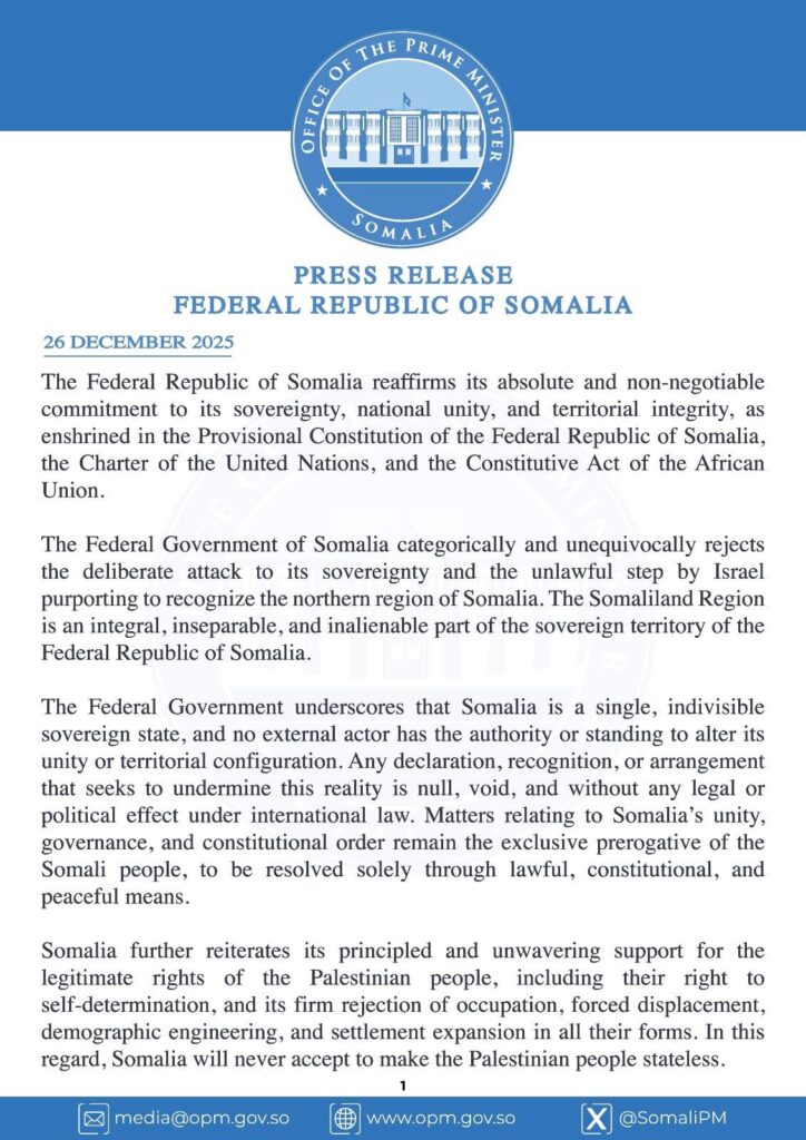 Dowladda Federaalka Soomaaliya ayaa si rasmi ah u shaacisay mowqifkeeda ku aaddan tallaabo kasta oo lagu sheeganayo aqoonsiga Somaliland, iyadoo ku tilmaantay mid sharci-darro ah oo ka hor imaanaysa Dastuurka Soomaaliya, Axdiga Qaramada Midoobay iyo Midowga Afrika.