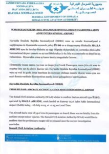 Hey’adda Duulista Rayidka Soomaaliyeed Civil Aviation ayaa war saxaafadeed ka soo saartay shilkii diyaaradeed ee ka dhacay garoonka Diyaaradaha Aadan Cadde.
