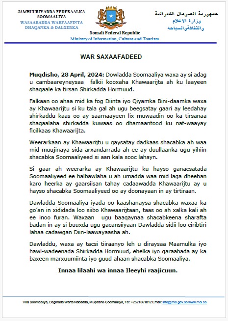 Dowladda Soomaaliya ayaa si adag u cambaareysay falkii kooxaha Khawaarijta ah ku laayeen shaqaale ka tirsan Shirkadda Hormuud sida lagu sheegay warqad kasoo baxay DFS.