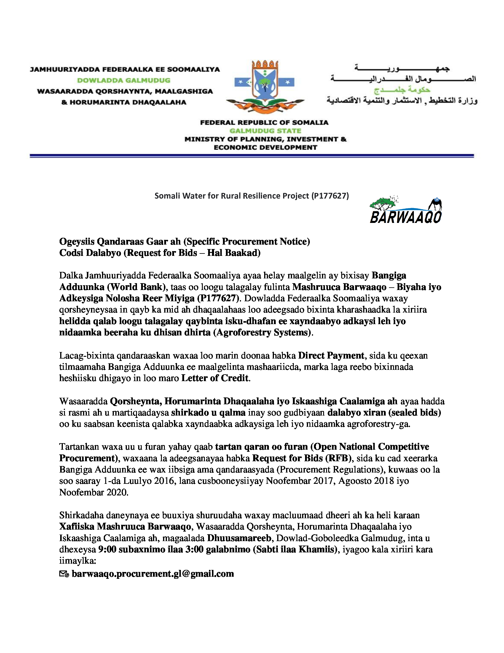 Soomaaliya oo Furay Tartanka Qandaraaska Xayndaab Adag iyo Nidaamka Agroforestry ee Mashruuca Barwaaqo, Galmudug.