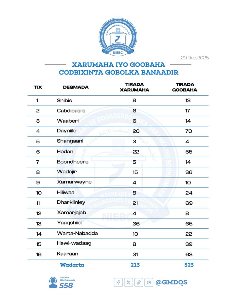 Guddoomiyaha Guddiga Madaxa-bannaan ee Doorashooyinka Qaranka ayaa si rasmi ah u shaaciyey tirada iyo goobaha ay ku yaallaan xarumaha codbixinta ee Gobolka Banaadir, kuwaas oo loo diyaariyey doorashada Golaha Deegaanka.