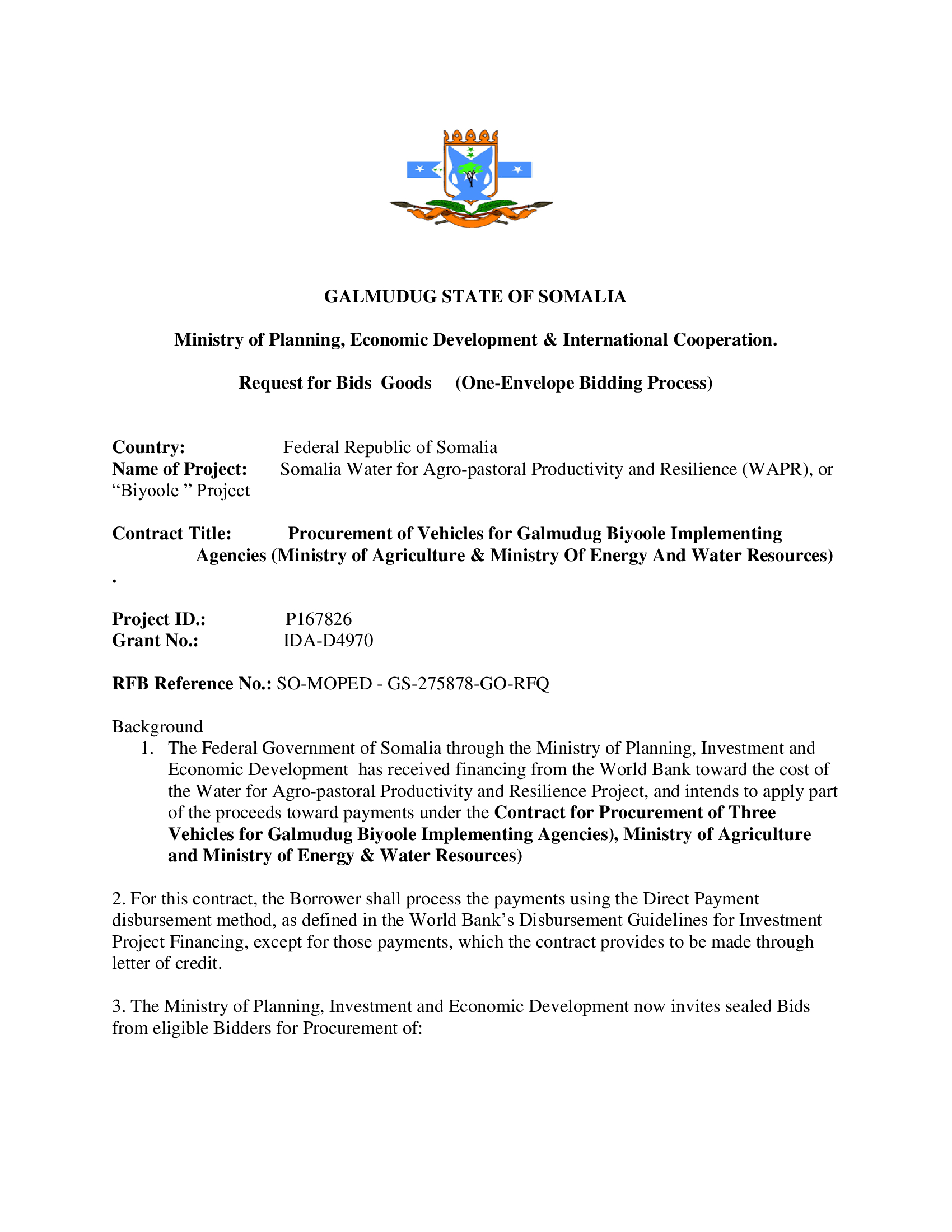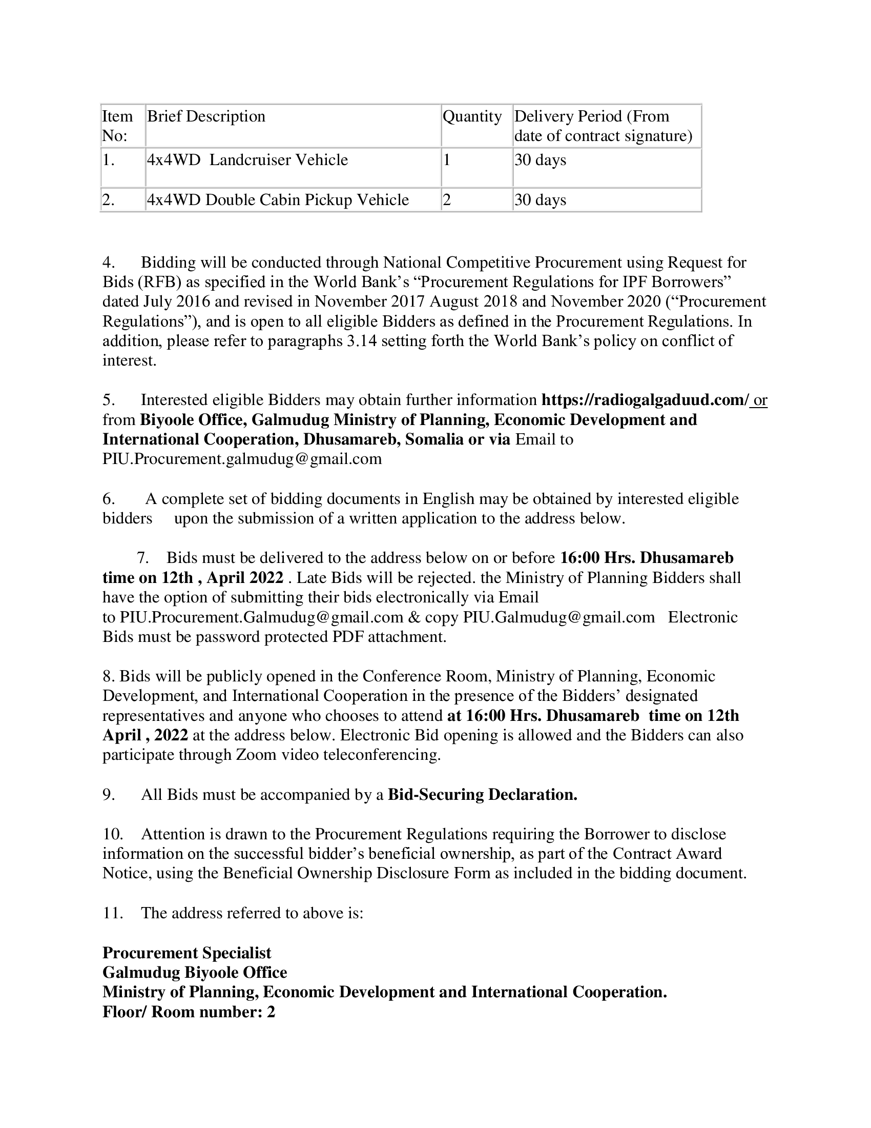 Invitation for Bids Procurement of Vehicles for Biyoole project 13/03/2022 FacebookTwitterLinkedinEmailPrint