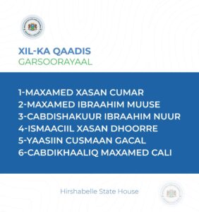 Qoraal kooban oo lagu daabacay barta Facebook ee Madaxtooyada Hirshabeelle ayaa lagu shaaciyay magacyada garsooreyaasha la eryay, balse lama caddeyn meelaha ay horey uga howlgalayeen iyo sababta keentay xil ka qaadistooda.