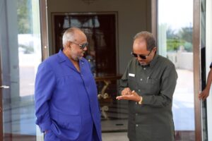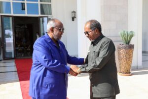 Madaxweynaha Jamhuuriyadda Federaalka Soomaaliya Mudane Xasan Sheekh Maxamuud iyo wafdi uu hoggaaminayo oo safar ku jooga dalka aan walaalaha nahay ee Jabuuti ayaa Qasriga Madaxtooyada dalkaasi kula kulmay dhiggiisa Jabuuti Mudane Ismaaciil Cumar Geelle.