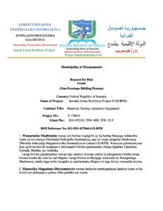 Mashruuca Dhisidda Adkeysiga Magaalooyinka Soomaaliya ee Labaad (SURPII), wuxuu ku martiqaadayaa qandaraaslayaal u qalma inay soo dalbadaan iibsiga qalabka baaritaanka. Soo codsadaha waa inuu soo gudbiyaa codsigiisa ugu dambeyn 10ka Sebtembar 2024. Waxa uuna kusoo dirayaa Eimailkaan: dhusamarebpiu@gmail.com.