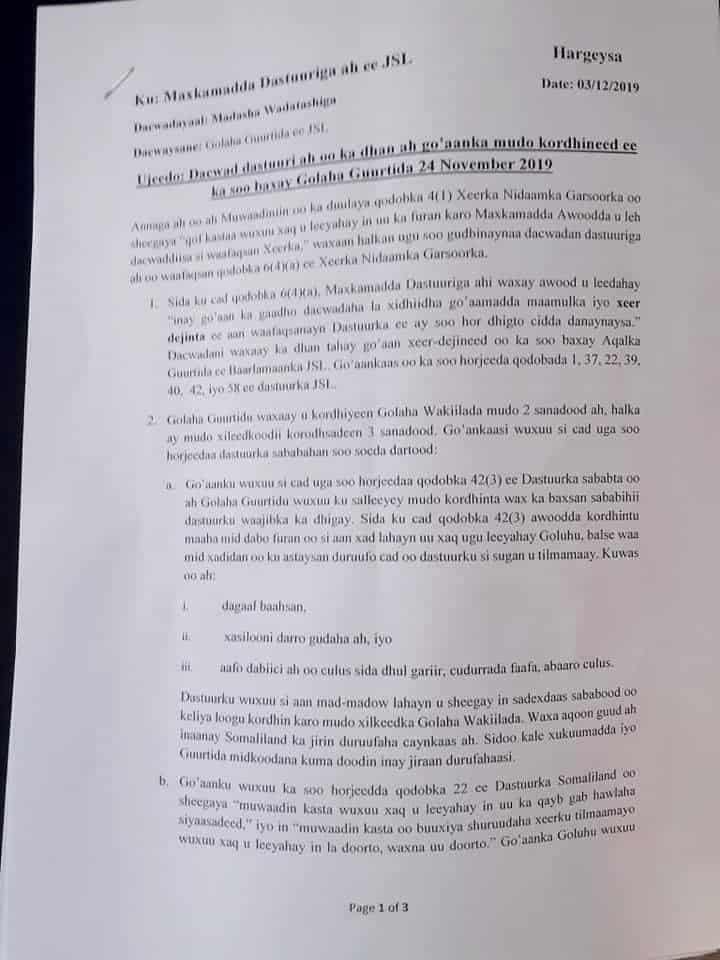 Hoos Ka Akhriso Qoraalka Dacwadda ah oo ay Maxkamadda Sare u gudbiyeen Siyaasiyiinta ku bahoobay Madasha Wadatashiga Somaliland.