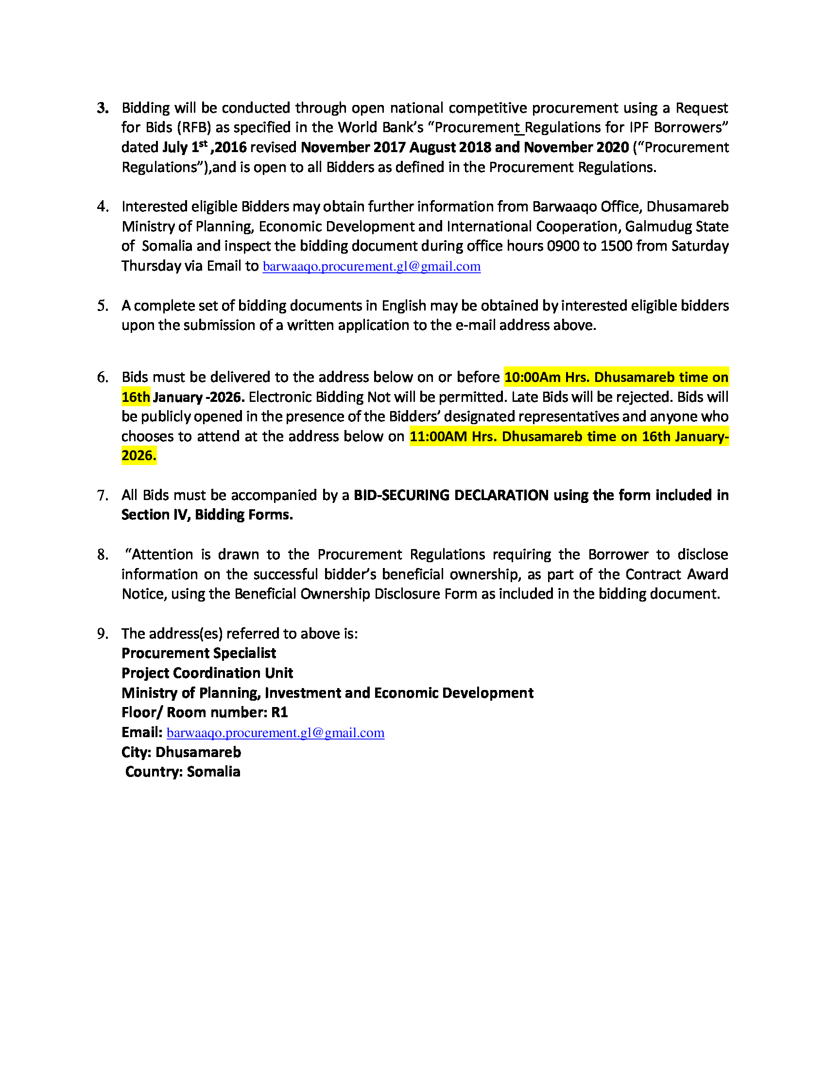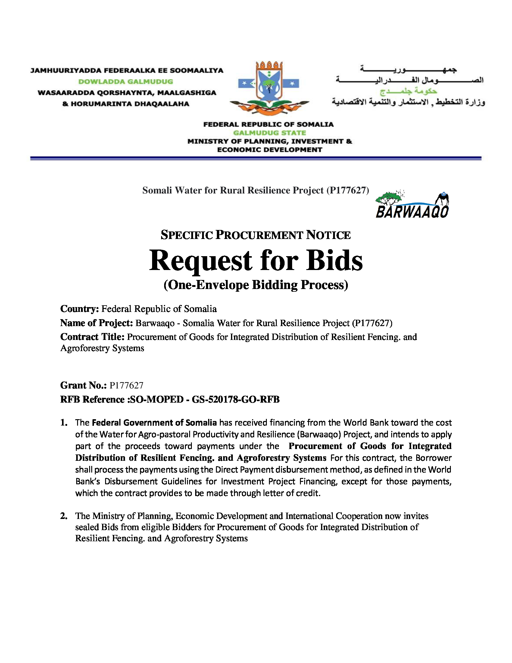 Somalia Issues Bid Invitation for Resilient Fencing and Agroforestry Systems under Barwaaqo Project in Galmudug State. 31/12/2025 FacebookTwitterLinkedinEmailPrint Somalia Issues Bid Invitation for Resilient Fencing and Agroforestry Systems under Barwaaqo Project in Galmudug State.