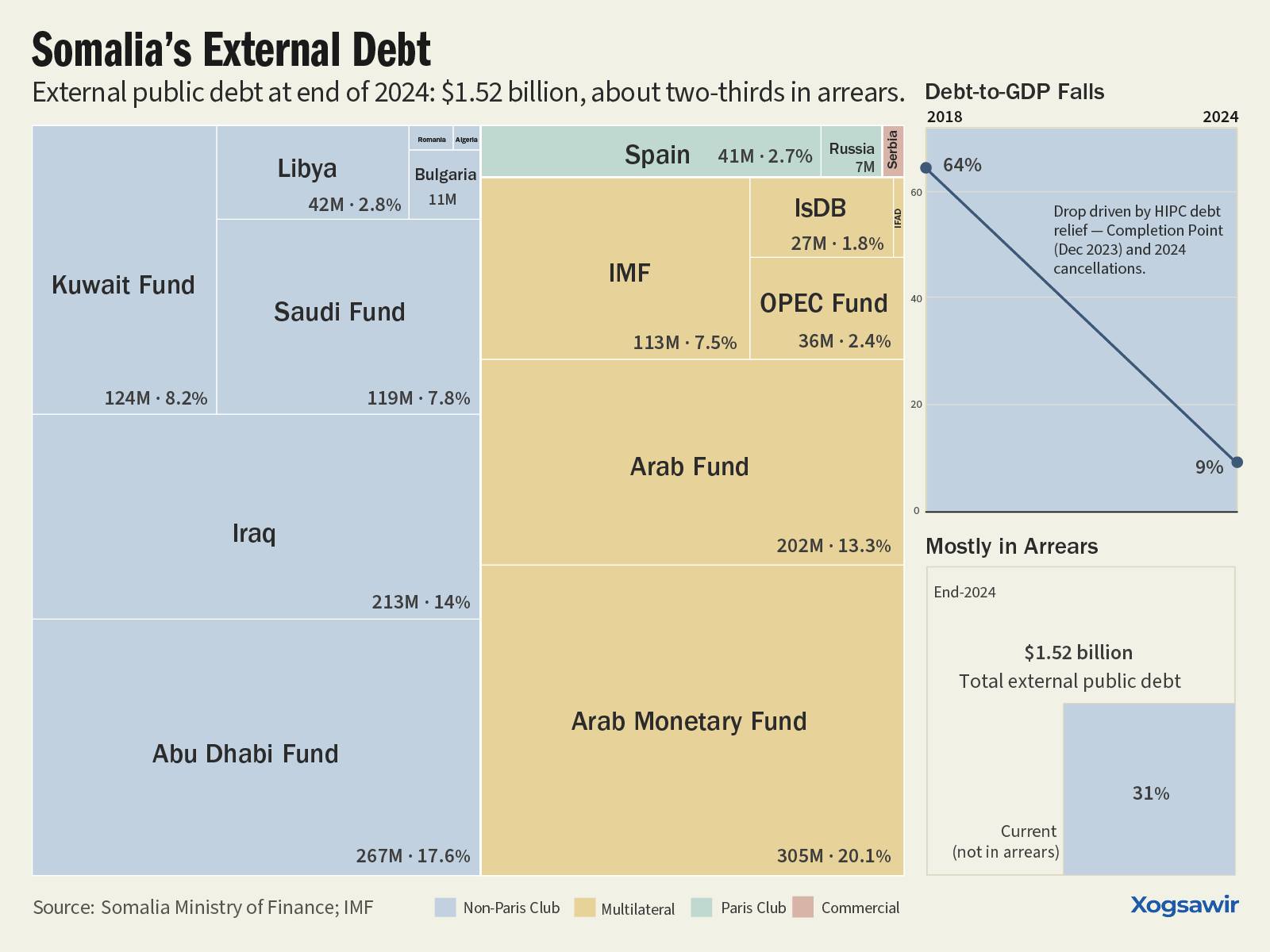 Somalia’s external public debt has plunged — from 64% of GDP in 2018 to just 9% by 2024 after #HIPC relief and recent cancellations, leaving about $1.52 billion still owed mainly to a few bilateral and Arab funds.