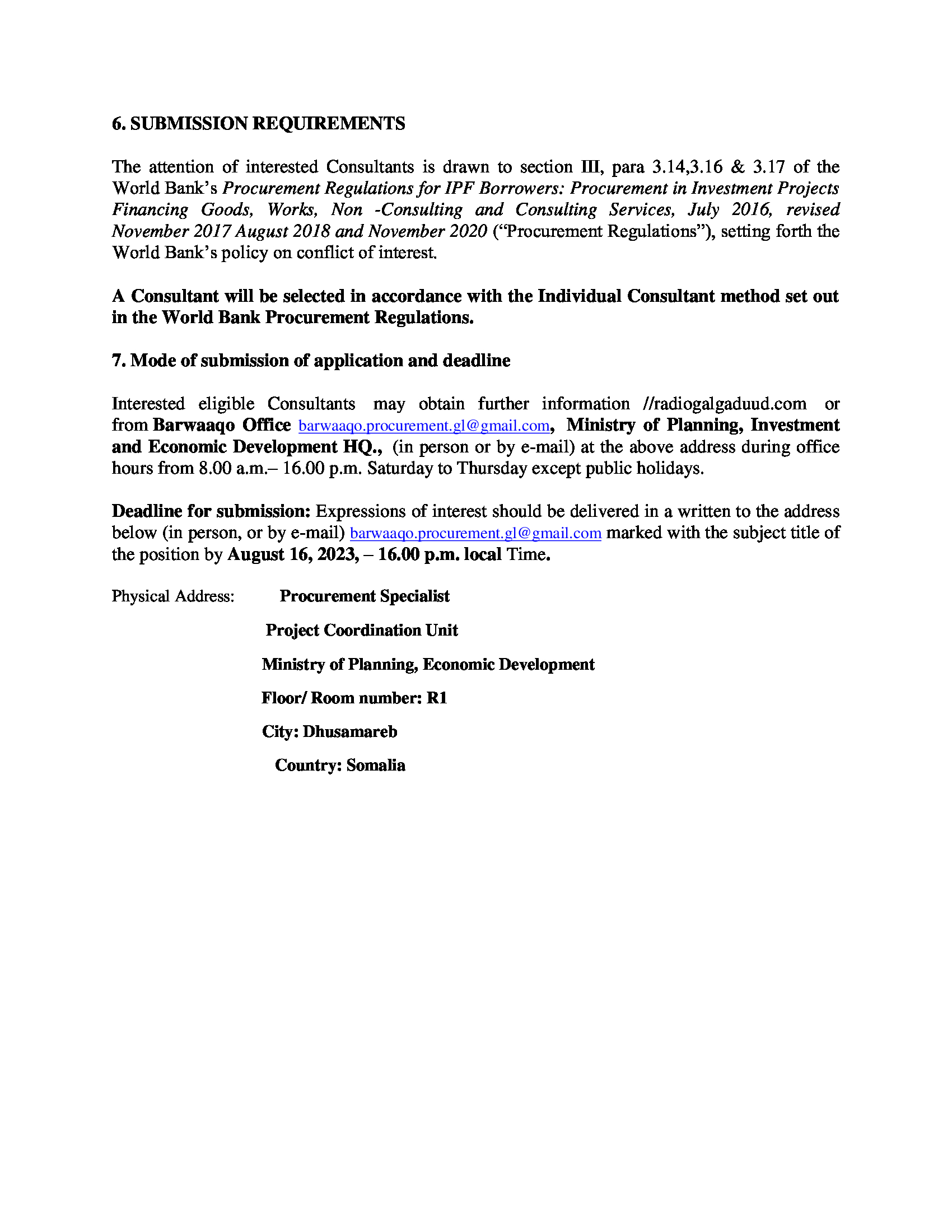The Ministry of Planning, Investment and Economic Development Galmudug is seeking to use a portion of finance to recruit a Project Community Development/Social Safeguards Specialist.