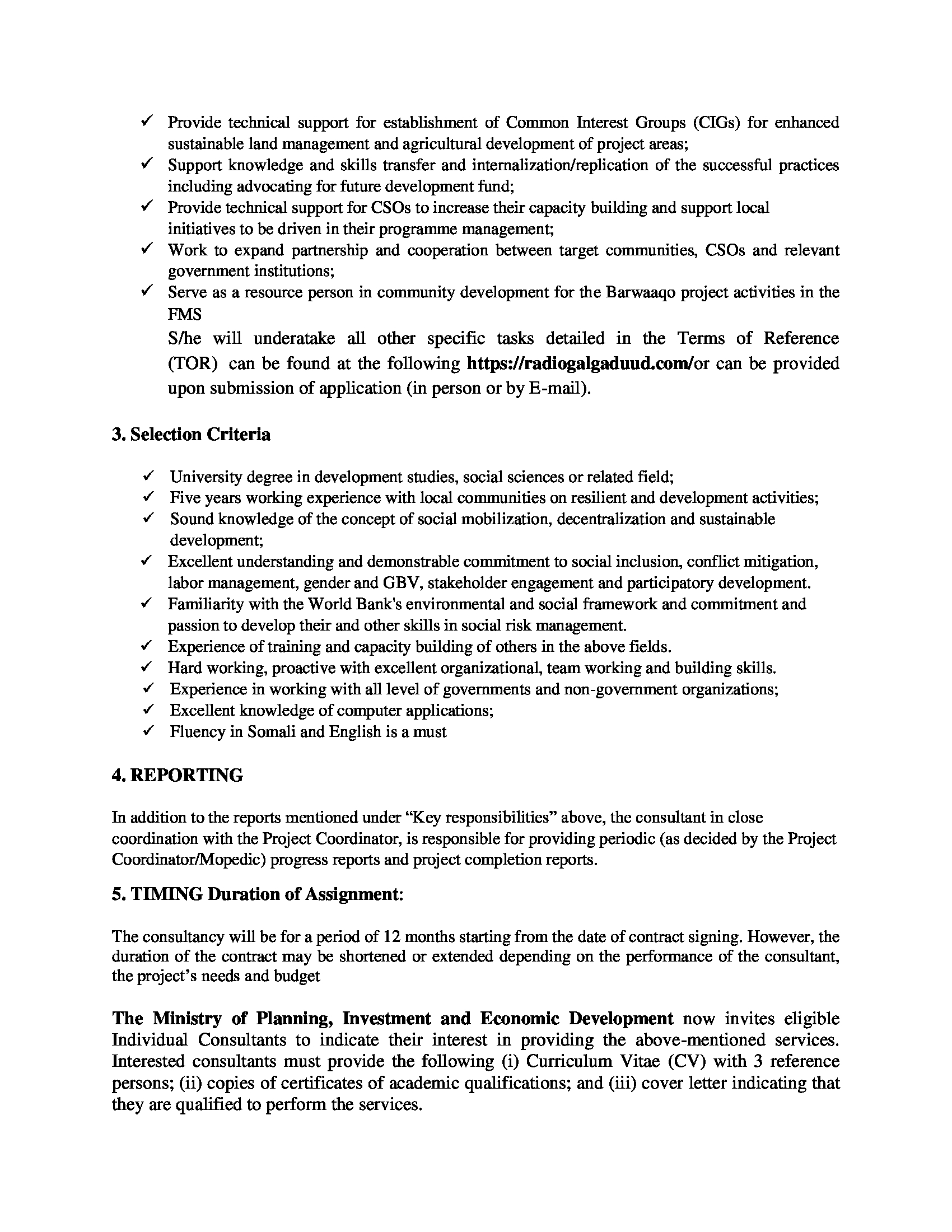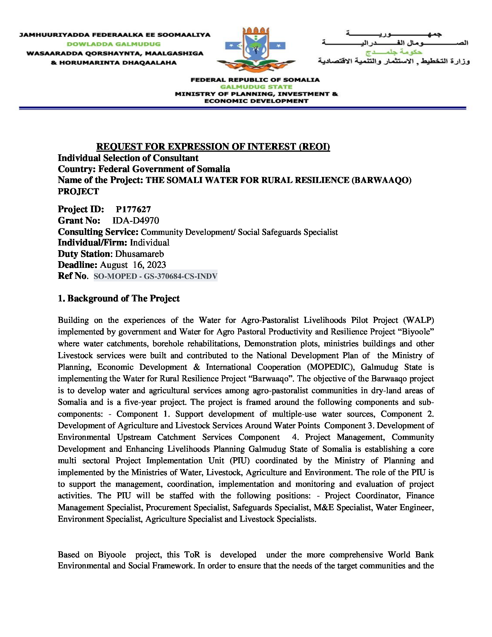 The Ministry of Planning, Investment and Economic Development Galmudug is seeking to use a portion of finance to recruit a Project Community Development/Social Safeguards Specialist.
