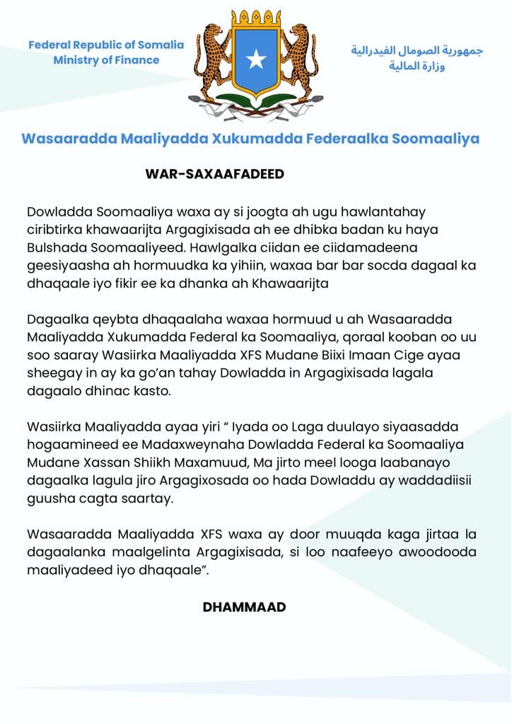 Wasaarada Maaliyada Soomaaliya oo sheegtay in ay DFS ay sii waddi doonto waddo kaste oo Alshabaab lagula dagaalamayo oo ay ugu horeyso dhanka Dhaqaalaha.