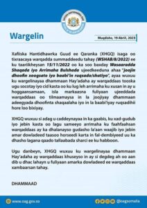 Xafiiska Hantidhawrka Guud ee Qaranka ayaa faray dhammaan Hay’adaha Dowladda ee ay khusayso inay u hoggaansamaan ayna fuliyaan amarkii horay uga soo baxay Wasaaradda Shaqada iyo Arrimaha Bulshada ee XFS ee la xiriiray joojinta adeegyada dhoofinta shaqaalaha Soomaaliyeed ee dibadda loo diro iyo baabi’inta ruqsadihii horay loo bixiyay.